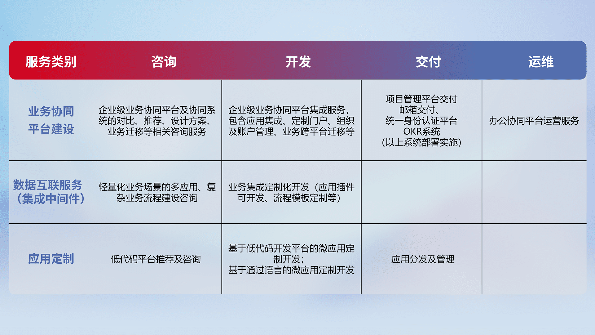 针对钉钉、、企微、、、IDaas等平台级产品提供产品的规划、、、方案、、、交付、、、、定制化开发等服务,,实现如统一协同办公、、、、智能客户服务、、、混合会议管理、、、、智能数据查询、、、、等业务场景,,,实现数字化转型。。。。